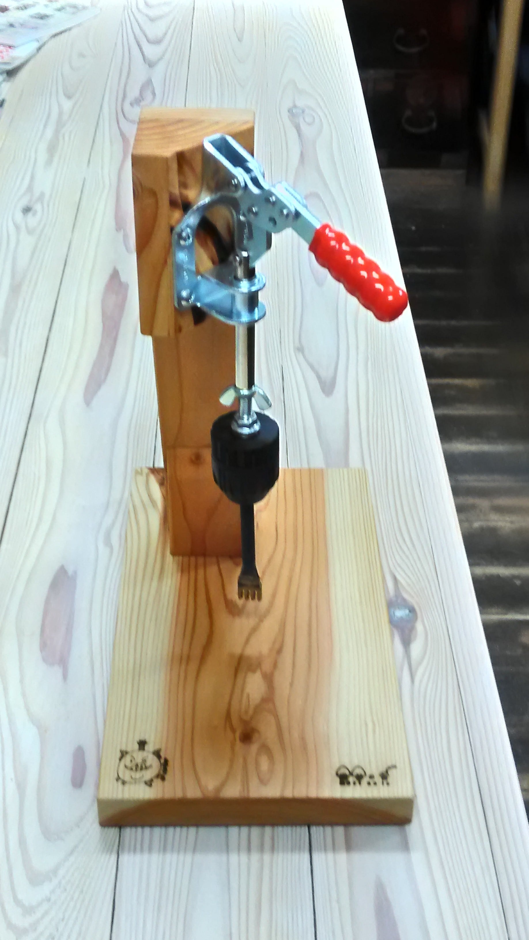 木で作りました、レザークラフトの菱穴打ちやパンチ等を付けてハンドプレスする機材です。